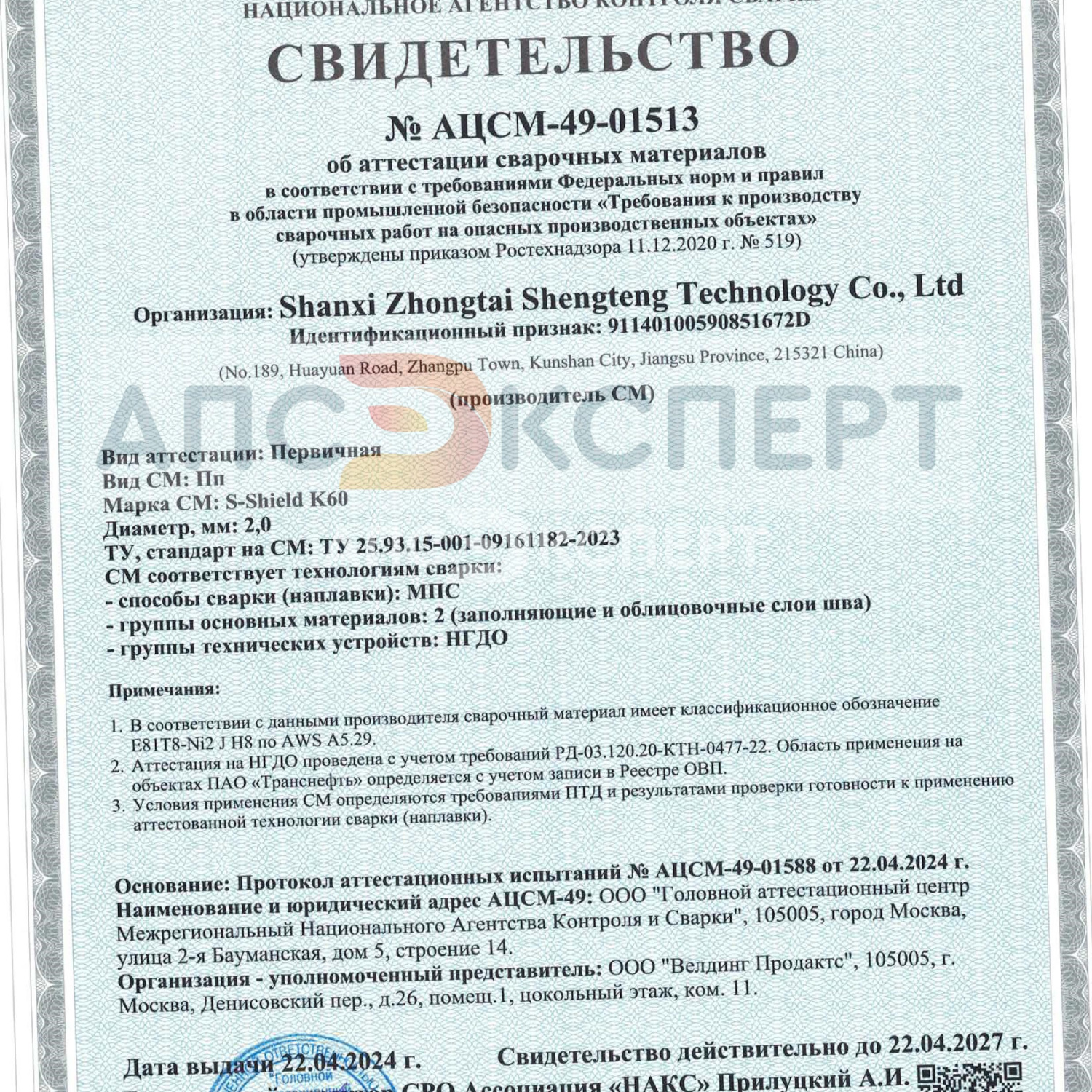 Наша компания провела успешные испытания партии сварочной проволоки S-Shield K-60 и по результатам проверки дополнительные испытания на строительных и монтажных площадках не потребуются, что подтверждает соответствие сварочной проволоки S-Shield K-60 всем необходимым требованиям (п. 6.8 "Программы проведения работ по испытаниям партий сварочных материалов, предназначенных для применения на объектах организаций системы "Транснефть".)